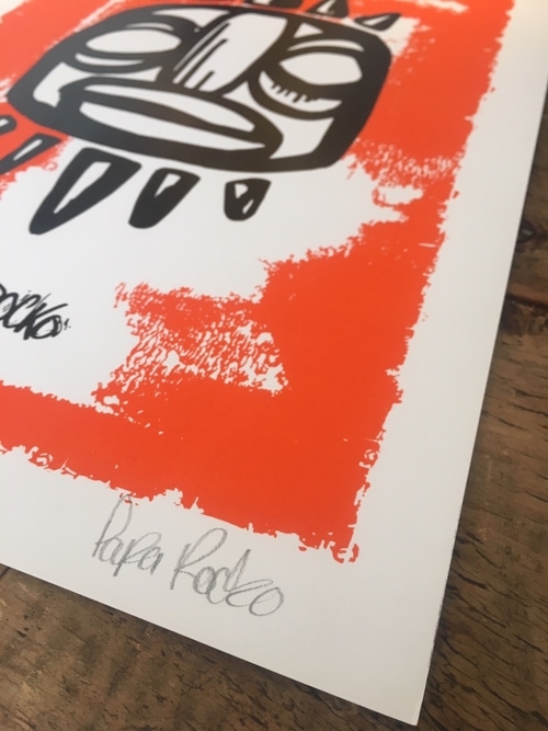 Silk screen print of 'Papa Legba'. Papa Legba is a Loa (God) in Haitian Vodou, serving as the intermediary between the Loa and humanity. In Haiti, he is the great elocutioner. Legba facilitates communication, speech, and understanding. who serves as the intermediary between the loa and humanity. Papa Legba is believed to speak all human languages.